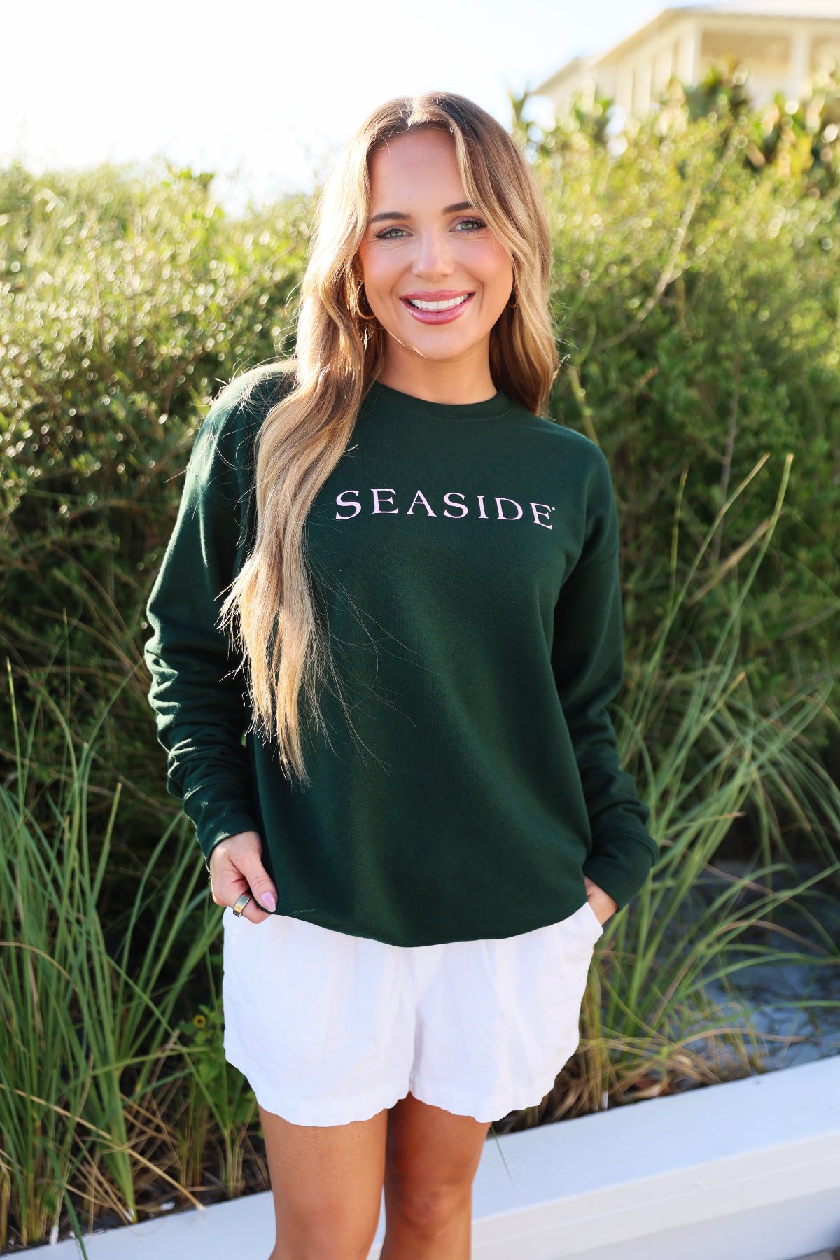 Haven’t you heard? Our latest online exclusive has arrived. Our Green Lightweight Sweatshirt features a light pink SEASIDE® logo on the front and “Where Bare Feet and Sandy Floors Rule” on the back. Pair it with our Pink SEASIDE® tee for effortless fall layering.