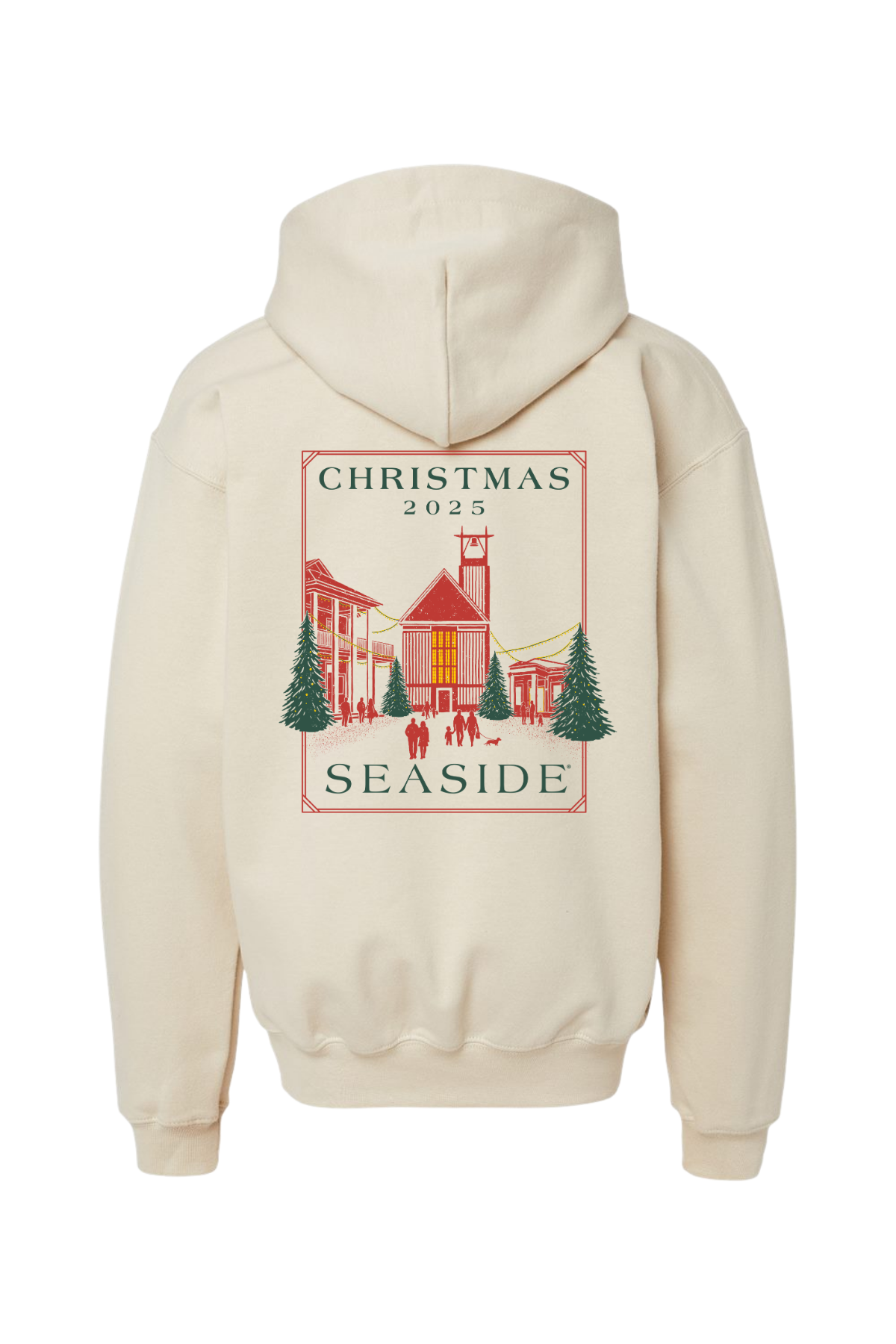 Celebrate the magic of the holidays in Seaside, Florida with our 2025 Youth Christmas Hoodie. Featuring an illustration of the Seaside Chapel and town square, this design captures our town during the most wonderful time of the year with families strolling, friends gathering, and Bud the Dachshund enjoying the season by their side.